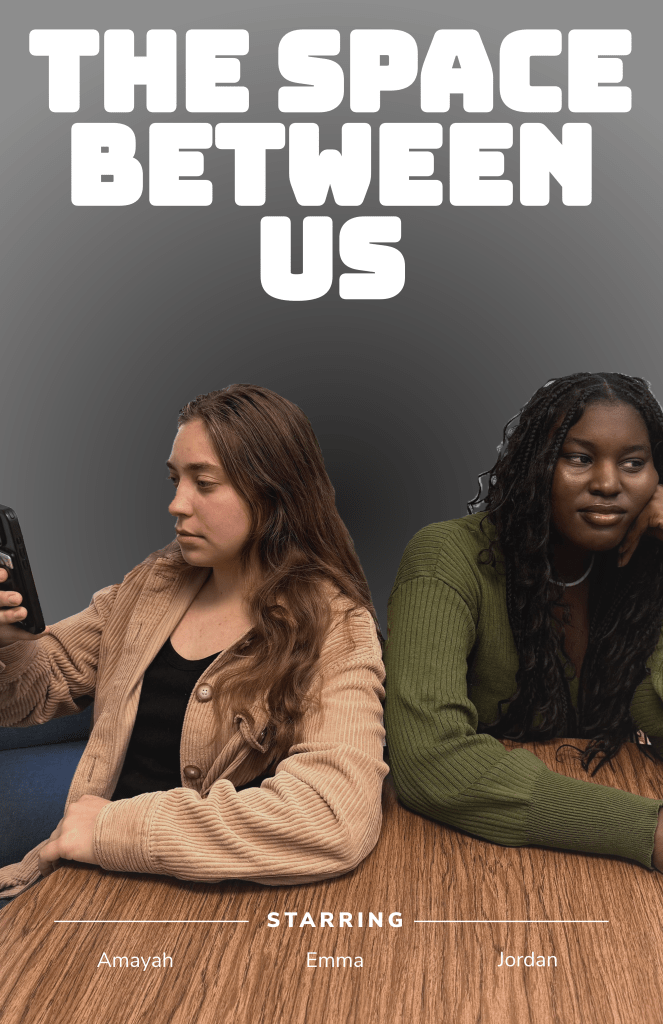 The Space Between Us is a drama-filled dialogue film that reflects on a common friendship breakup, which ultimately ended over a boy. The film follows the social norms of relationships fizzling out over time due to “ghosting culture,” leaving simple issues to remain unresolved, while communicating its message through a combination of visuals and a series of dialogue primarily between two main characters.